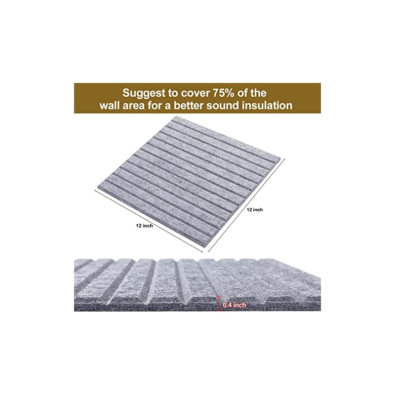 • EASY INSTALLATIONNo special tools or materials are needed when installation,just peel off the coating on the back,place the felt soundproof board in your favorite position,press hard for a few seconds,and it will stick to the wall tightly. Each acoustic board size is 12x12x0.4 inch.Suggest to cover 75% of the wall area for a better sound insulation.