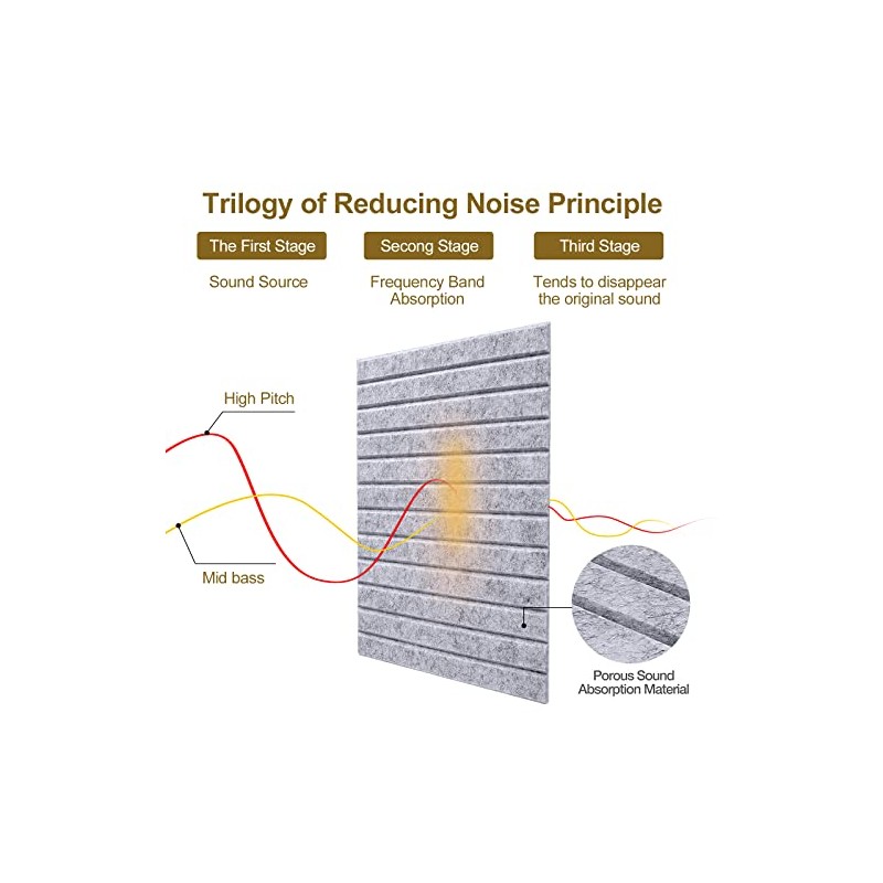 • SUPER SOUND INSULATIONThe fashionable groove face plate design,it not only absorb the noises but also it can be as a wall decoration.If you are mixing in a recording studio,you must reduce the ambient sound.Any unnecessary noise will spoil the recording.The artistic acoustic panels absorbs the sound produced by low frequency,middle frequency and high frequency, making it very suitable for recording.Just built and enjoy your live show.