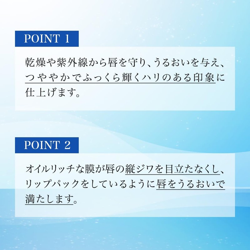 - (Moisturizing Care for Sensitive Lips) Protects lips from dryness and moisturizes and creates a glossy and plump impression. The oil-rich thick membrane makes the lip's vertical crease noticeable, and moisturizes your lips like they are lippacking. Prevents lips, peeling, cracks, cramps, crumbers, dullness, blackheads, and pigment deposit. (* The lips are extremely thin and there is no sebum glands or sebum membranes, so the moisture is about 6 times more easily flying off your skin, and it is said to be easy to dry. )