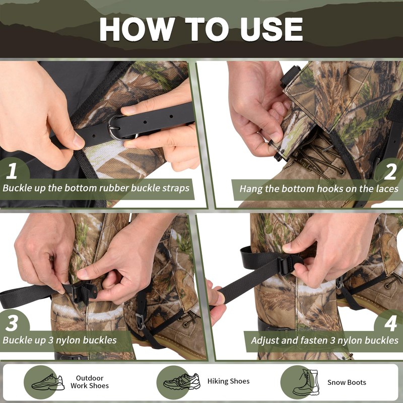 - TOTAL PROTECTION GATORS FOR HIKING BOOTS: Our gaiters aren't just waterproof—they're full-featured shields. Snowproof, waterproof, and dustproof, they offer uncompromising protection against the elements, making them essential for any snowy expedition.
