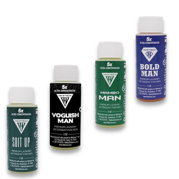 Are you unsure of what laundry detergent is the perfect fit for your lifestyle? Look no further! Our 4-pack masculine scent sample kit at Hiketron is the perfect solution. With eight 2 fl oz bottles, you can try a variety of scents and find the one that you love. Each bottle is enough for 2-8 loads, depending on your soil levels, load size, and type of clothes. Plus, our detergent line is not only effective at cleaning your clothes but also environmentally friendly and healthy for you and your family. Discover your new favorite detergent with our sample kit today!Benefits5X Ultra Concentrated products and biodegradable using sugar-based surfactantsIt contains a super blend of 6 bio-enzymes to remove tough stainsSoftens fabrics and keeps your clothes fresh without fragranceSafe on all fabrics, colors & whitesFree of dyes, optical brighteners, phosphates and dioxane, lauryl sulfates, laureth sulfates, parabens, and formaldehydeCould be used as a Pre-Soak or as a standalone detergentSpecially packaged in a 40 fl. oz bottle for easy storage & handlingDesigned for hand washing, standard, and high-efficiency machinesEnhanced energy and water efficiency with cold or warm water washingSafe for septic systems and greywaterDirectionsFollow apparel care instructions. For tough stains pretreat by pouring the clear & powerful liquid laundry detergent directly onto the fabric, rub gently, and soak for 1 hour or overnight if the stains are big. Use a Dispenser for HE washers. For Standard washers, start the washer, add detergent to water, then add clothes.Based on our testing, the following dosages will guide you to determine the correct amount needed per load. Customers are free to try more or less of the recommended amounts to fit their lifestyle. Washing Type Small & Medium Loads Heavy Soiled Loads Fill Line High-Efficiency Machine (HE) 0.4 fl oz 1 fl oz 1 (0.4 fl oz)/ 2 (0.75 fl oz) Regular Machine 0.75 fl oz 1.5 fl oz 3 (1 fl oz) / 4 (1.5 fl oz)Hand Wash 0.75 fl oz 1.5 fl oz Brimful (1.8 fl oz)Gallery
