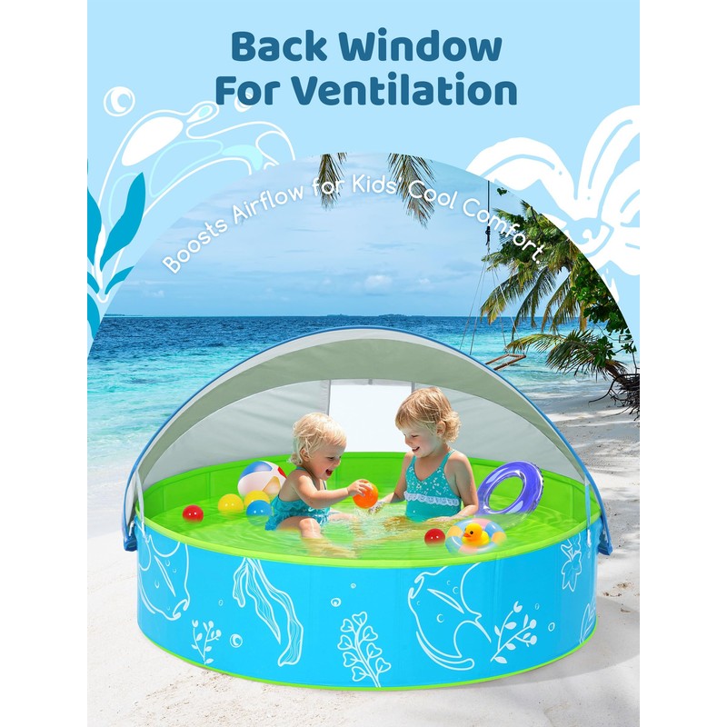 Hikiddy Foldable Kiddie Pool with Canopy: 47in Baby Pool and Beach Tent for Toddlers Infants 6-12 Months and Kids 2-4 Years Old - Portable Water Play with Shade for Outdoor Backyard Beach (Blue-Green)