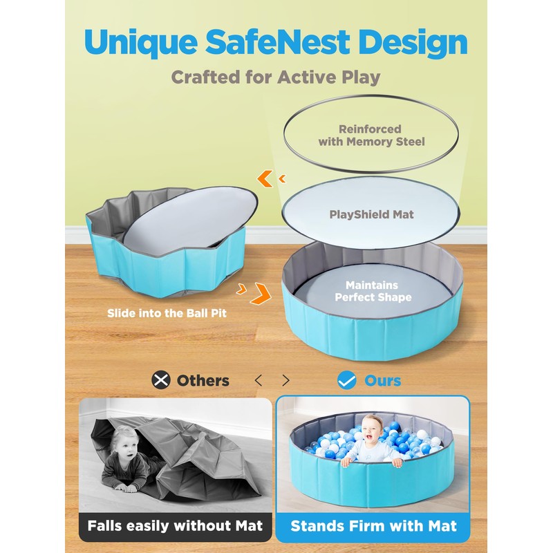 - Unique Playmat Design Ensures Safety: Our design thoughtfully includes a pop-up playmat crafted from high-strength memory steel holders, ensuring the ball pit retains its shape flawlessly and offers solid support as children play. This innovative approach offers parents peace of mind knowing their little ones are safe.