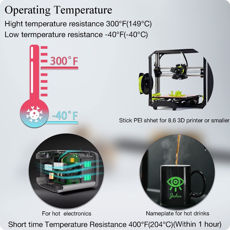- Features--Excellent heat resistant (Up to 400F), waterproof (Immersion in water is OK),Thin (5.2mil),Clear. It provides outstanding adhesion to metal and high surface energy plastics(ABS and polycarbonates......).It also performs well after exposure to humidity and hot/cold cycles