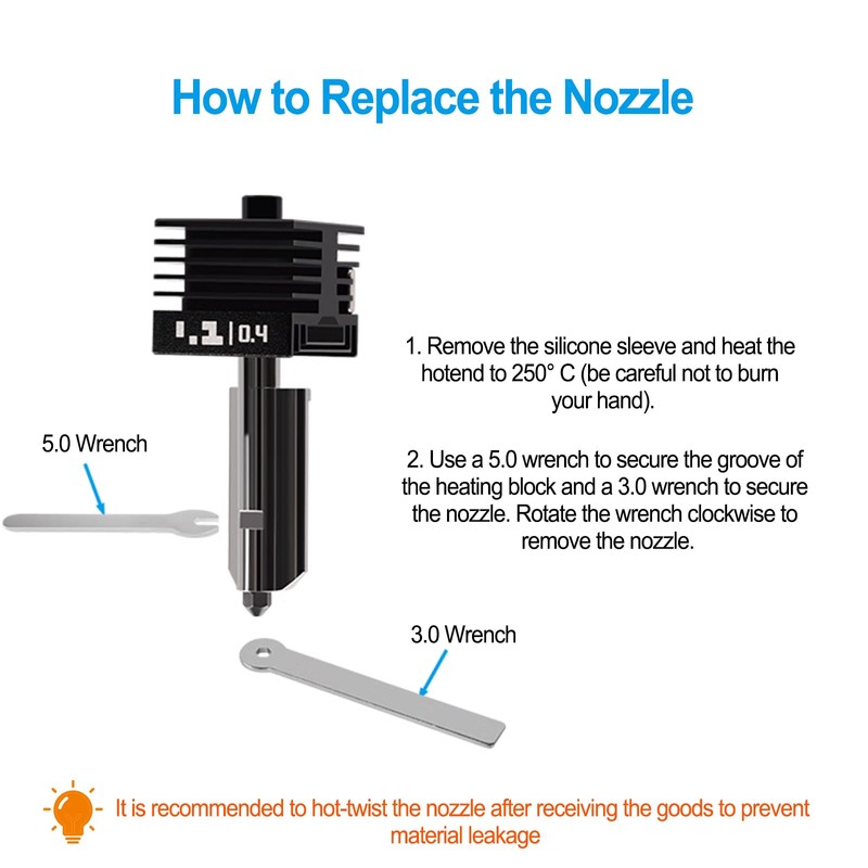 - Super Durable Material: This nozzle is made of hardened steel SKD11 material, the smooth inner wall which reduces clogging and improves printing quality. The max temp could reach 500c, and the hardness is over HRC60 can reduce the abrasion to the inner and outer of the nozzle during long-time printing, achieving high-quality printing