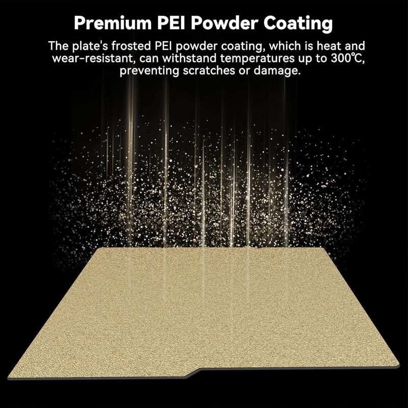 - Experience our versatile double-sided Gold PEI+PEI printing platform! The double-sided powder coating made of frosted PEI improves adhesion and reduces deformation. The spring steel plate guarantees easy removal and durability and perfectly complements the flexible magnetic sticker that keeps your prints safe throughout the printing process.