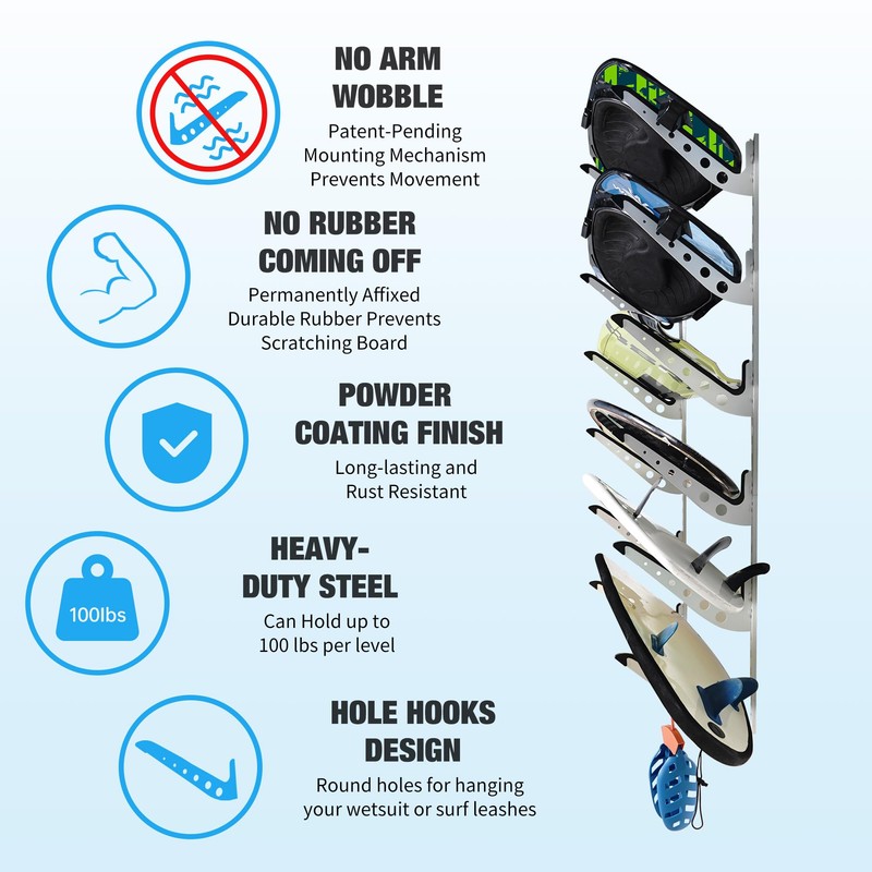 - 6 BOARDS STORAGE RACK - This adjustable surfboard wall rack is designed to hold 6 boards, making it ideal for storing surfboards, wakeboards, snowboards, kneeboards and longboards. It's perfect for organizing your gear in a nice way