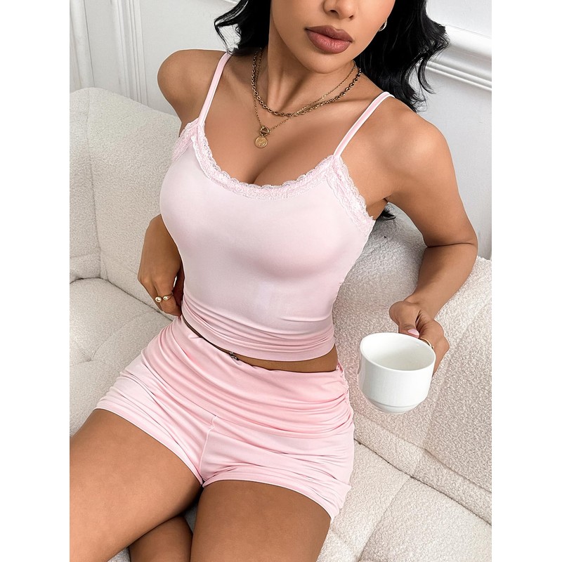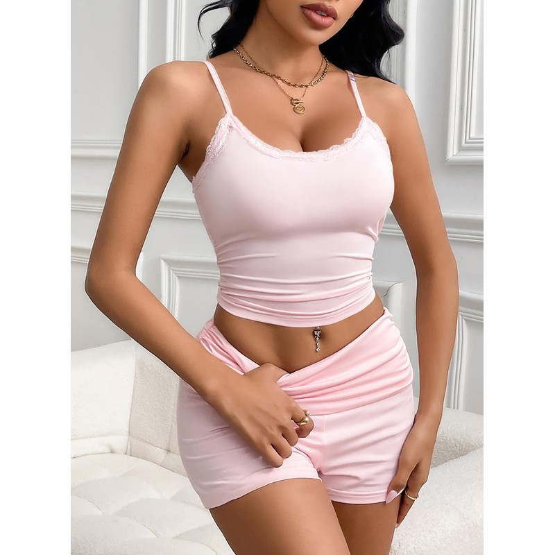 Lounge in style with our trendy women's two piece lounge sets, including a sleeveless cropped camisole and soft shorts, complete with lace hem and comfortable fabric.