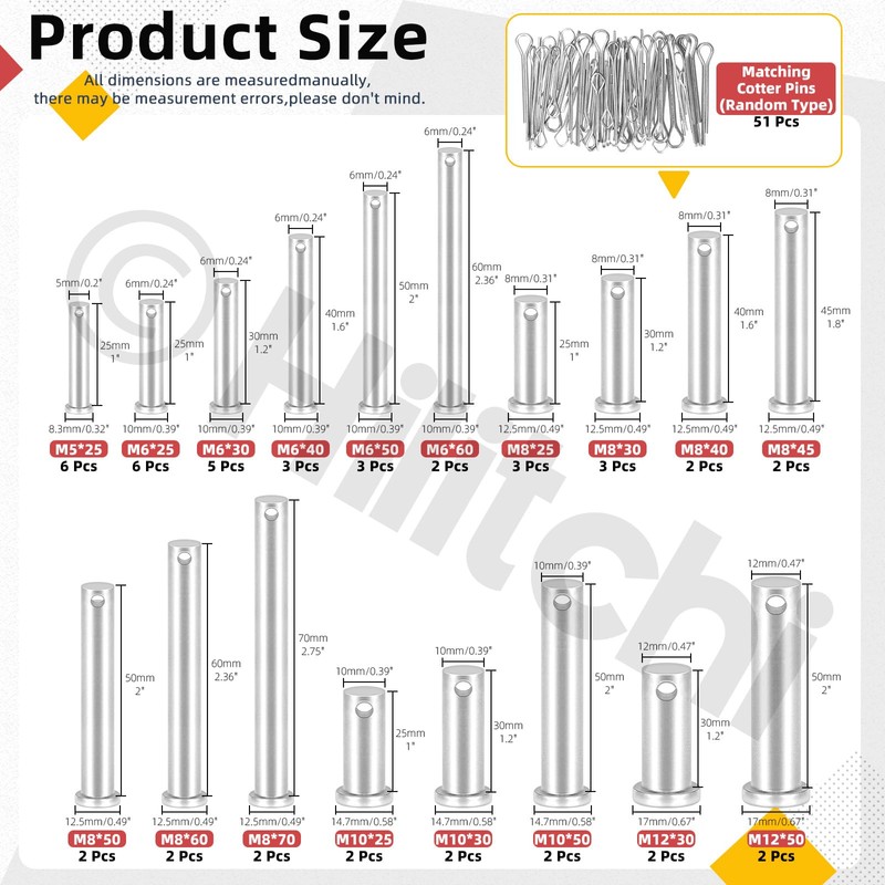 - 💕【What You Will Get】In this kit, you will get 6pcs M5 clevis pins, 19pcs M6 clevis pins, 16pcs M8 clevis pins, 6pcs M10 clevis pins, and 4pcs M12 clevis pins, in total 51pcs.They are packed well in a transparent box for easy storage and carrying. The box is labeled with corresponding dimensions and compartments inside to help you quickly find what you need.