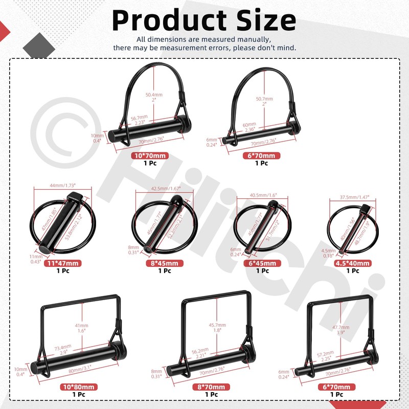 - 🔶【8 Sizes and 3 Types】Wire lock pin come with 8 different sizes and 3 types, which are O-type, D-type, Square-type and 4.5 x 40mm, 6 x 45mm, 8 x 45mm, 11 x 47mm, 6 x 70mm, 10 x 70mm, 8 x 70mm, 10 x 80mm. Assortment kits of wire lock pin can meet your needs of daily use.