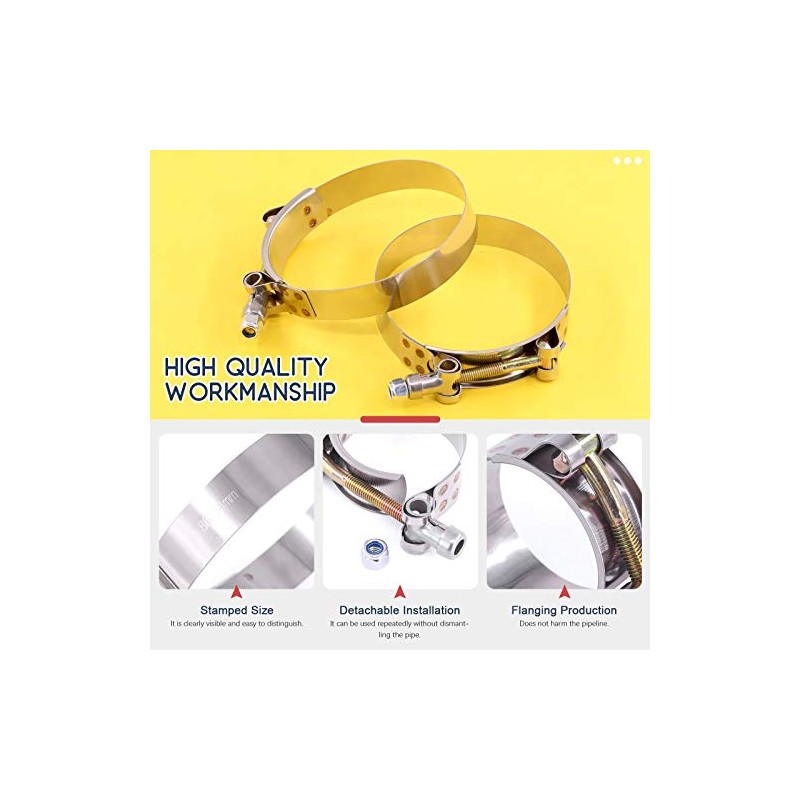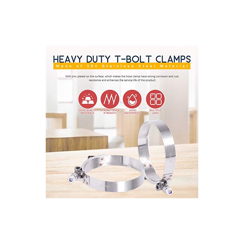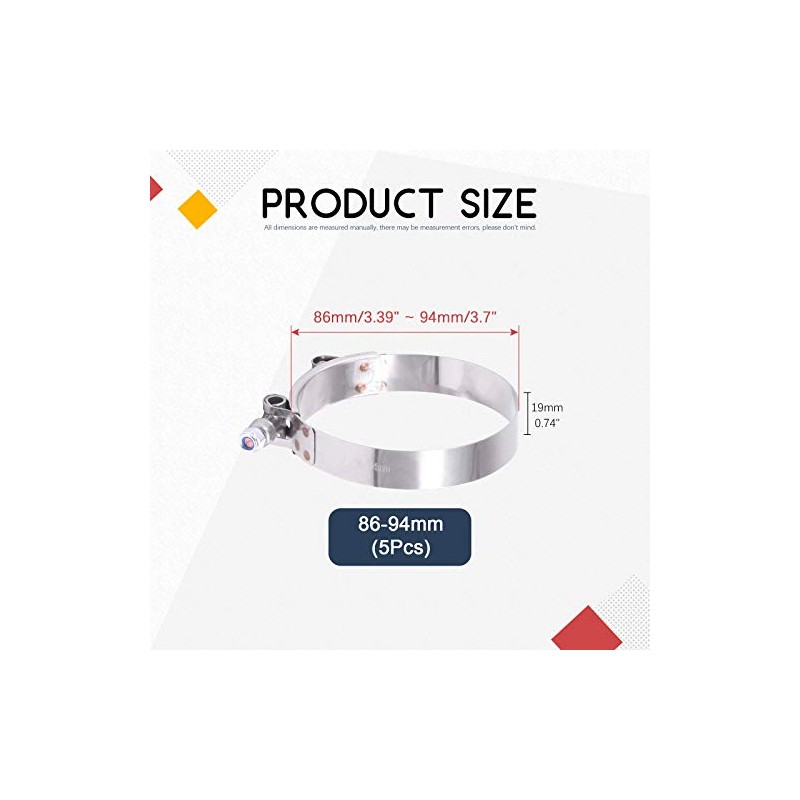 Hilitchi 5Pcs Stainless Steel T-Bolt Clamps with Rounded Band Edges Heavy Duty Turbo Intake Intercooler Clamp (86-94MM) for 3 1/2 InchFEATURES:Focusing on quality and with fine buffingSmooth surface without burrGood tightening effect, durable, no rust, corrosion resistanceSmooth and no uneven marksComplete modelRemovable installation and reusableSpecificationProduct Type: T-Bolt hose clampMaterial: Stainless steelSize: 86-94mmNumber of items: 5Pcs