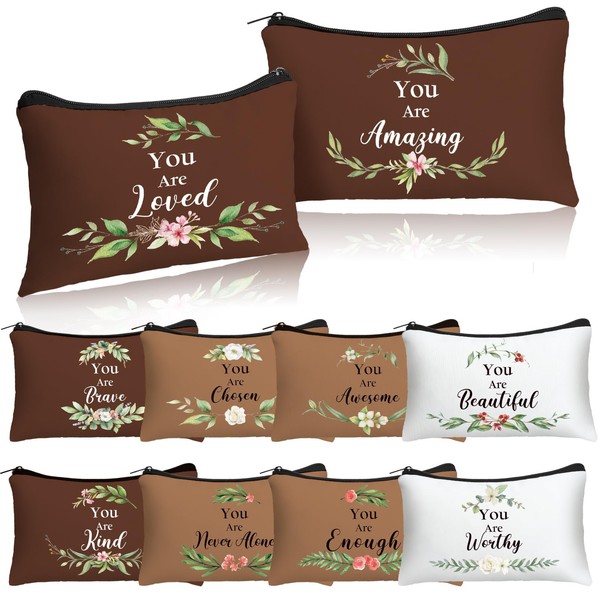 Hillban 10 Pcs Cosmetic Bag for Women Valentine Gifts Employee Appreciation Week Gifts Christian Bible Verse Makeup Bags You Are Amazing Inspirational Religious Bag for Women(Flower,Brown)
