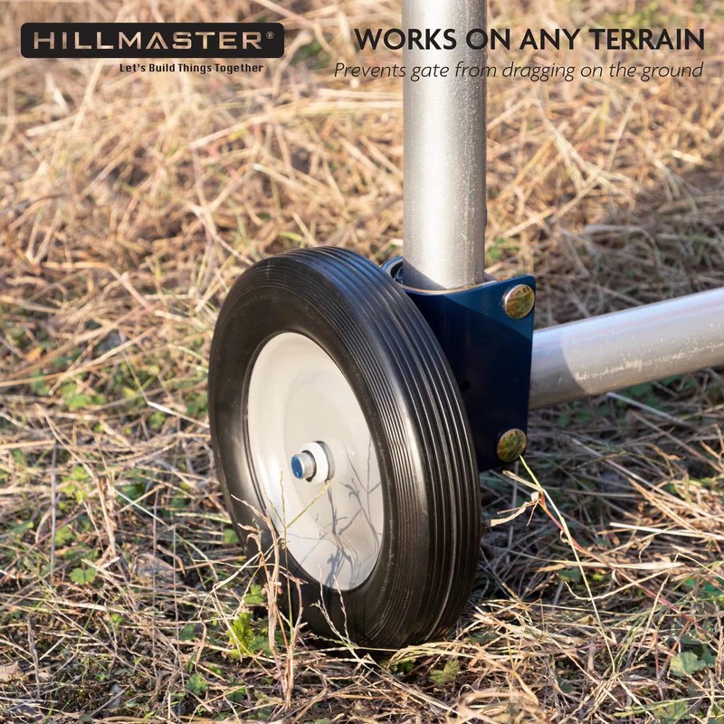 - 【MULTI-PURPOSE】HILLMASTER durable gate helper wheel can handle a multitude of different terrains, preventing the gate from sagging and saving gate hinges, perfect for chain link fence gate, ranch gate, cattle fence, farm pipe gates, pool gate, metal gate, swing gate, garden, yard, patio, driveway, moving smoothly on grass, gravel ground and concrete.