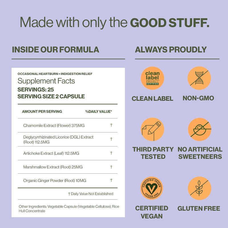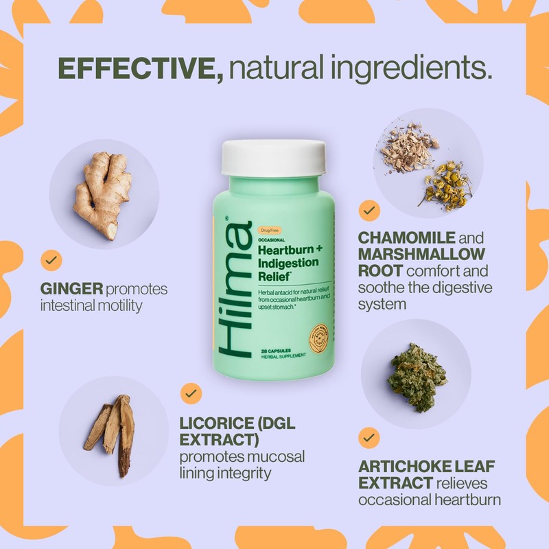 - Occasional Heartburn + Indigestion? - Get effective, drug-free relief. Hilma uses herbs that relieve occasional acid reflux + heartburn: Chamomile, Ginger, Marshmallow Root, DGL Licorice, Artichoke Leaf.* Ditch the chalky, sugary pills and syrups.