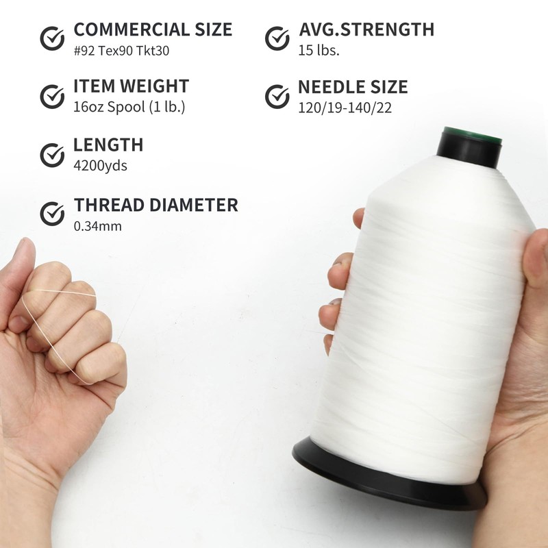 - Commercial Size: #92 Tex90 Tkt30 Bonded Nylon Thread is a medium-weight thread used for stitching leather,upholstery,canvas,and vinyl.Cone weight : 1 lb. Length:4200 yards.The Thread Diameter Thickness is 0.34mm,Thread Avg.Strength 15 lbs.Needle size: 120/19 or 140/22.