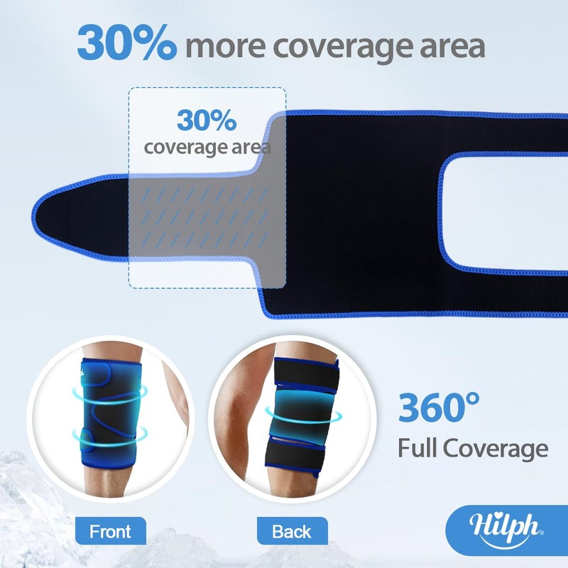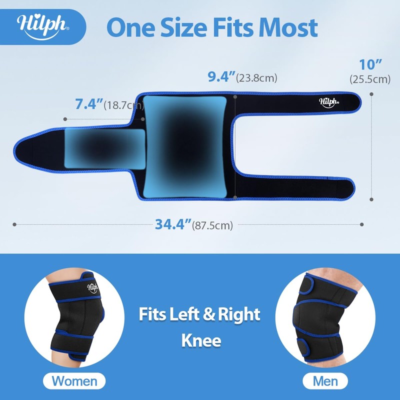 - Full Coverage Design for Entire Knee - Hilph knee ice pack wrap include a big knee brace and two ice packs. The knee brace wrap made of diving cloth cover and breathable elastic lining, very soft and skin-friendly. It is lined with two pockets, the big one is designed for the bigger gel pack to keep cold for knee cap, a small gel pack in the side pocket for the back knee. Three adjustable neoprene straps with velco can achieve different compression. The size is big enough to fit all people.