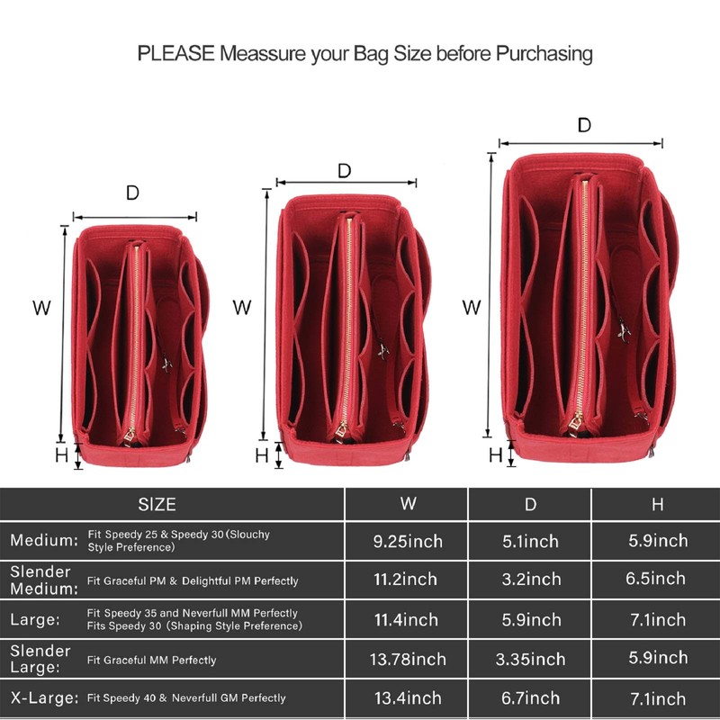 • 5 Size: Medium: 9.25(W) *5.9(H)*5.1(D) inches Fits Speedy 25 & Speedy 30 (Slouchy Style Preference). Medium Slender: 11.2(W)*6.5(H)*3.2(D)inch Fit Graceful PM & Delightful PM Perfectly. Large: 11.4(W)* 7.1(H)*5.9(D)inches Fits Speedy 35 and Neverfull MM Perfectly and Fits Speedy 30 (Shaping Style Preference). Large Slender: 13.78(W)*5.9(H)*3.35(D)Fit Graceful MM Perfectly. X-Large: 13.4(W)* 7.1.(H)*6.7(D) fits Speedy 40 and Neverfull GM Perfectly