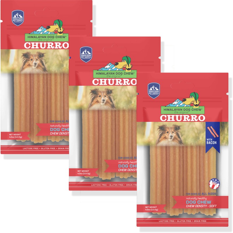 Himalayan Dog Chew Churro Himalayan Cheese Treats | Lactose Free - Gluten Free - Wheat Free -Soy Free| Made in USA | for All Breeds | Bacon Flavor | 3 Resealable Pouches