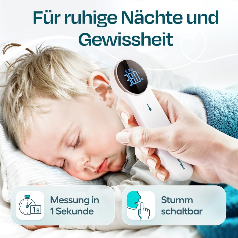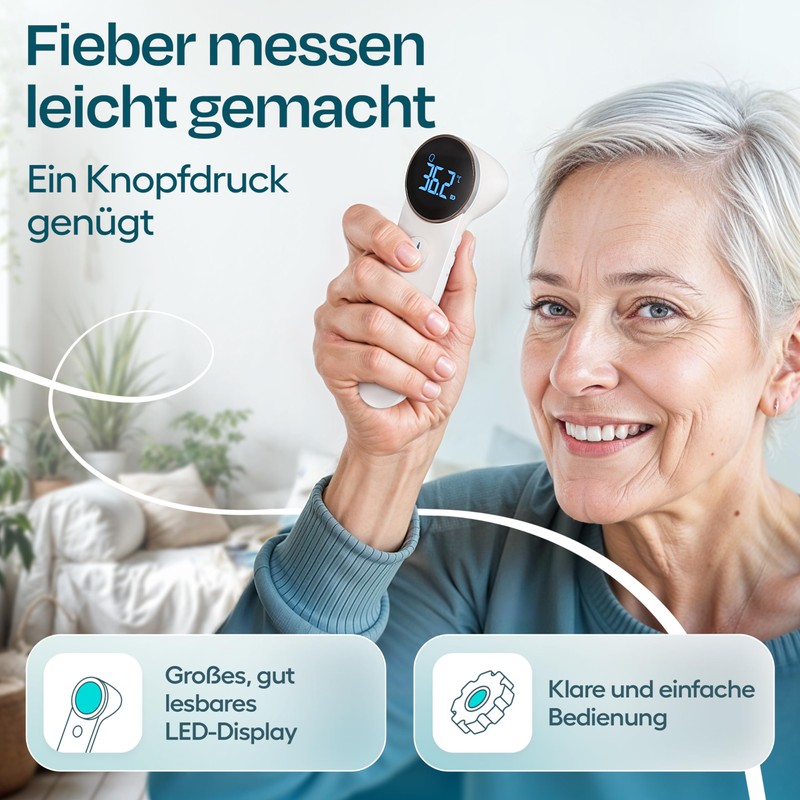 - Easy to use: intuitive one-button operation, automatic switching between ear and forehead measurement - no confusion, no errors. Ideal for tired parents in hectic everyday life.