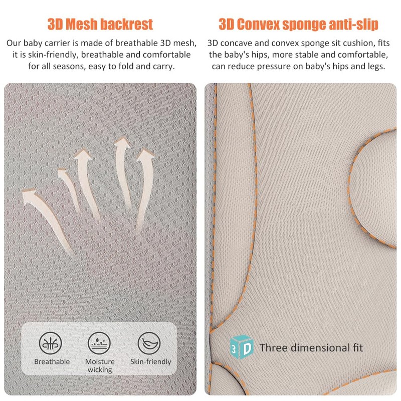 - Mesh Fabric&Cotton Material: Our baby carrier is made of breathable 3D mesh and soft cotton, it is skin-friendly, breathable and comfortable for all seasons, easy to fold and carry. Thickened padding around the edges provides support for the baby's head and neck, also prevents bruising of the baby's legs and the wearer's shoulders, providing parents with the convenience of safe, breastfeeding.