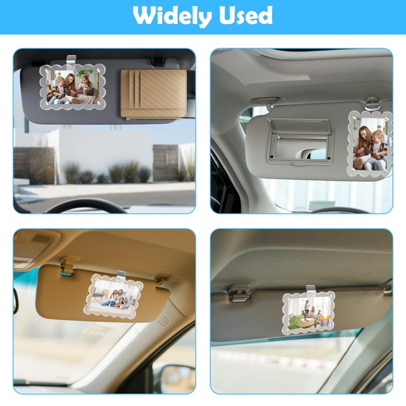 - 【Easy to Use】Personalizing your car has never been easier with this intuitive and easy-to-use car visor picture holder. Simply slide the two magnetic acrylic panels apart, insert a 2.4 x 3.5-inch photo, and snap them back together - no tools or complicated steps required. Its easy-to-use design allows even first-time users to create a personalized display in seconds, turning your visor into a dynamic photo gallery.
