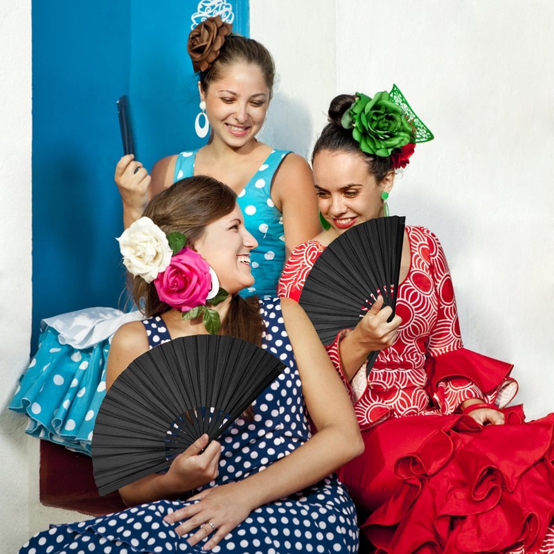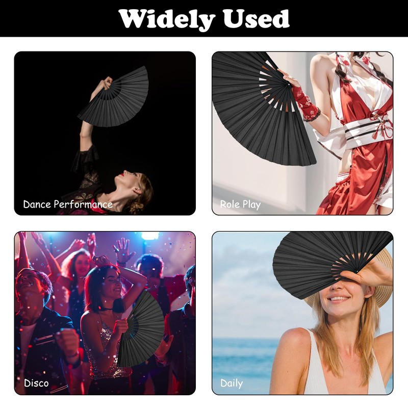 - High-quality material: This fan for line dance is designed for intense training. The fan ribs are made of bamboo wood, which ensures a long service life. Unlike plastic alternatives, bamboo wood cannot be easily damaged during carnival or disco nights. The high quality fabric retains its jet black sheen whether used for daily cooling or stage performances.
