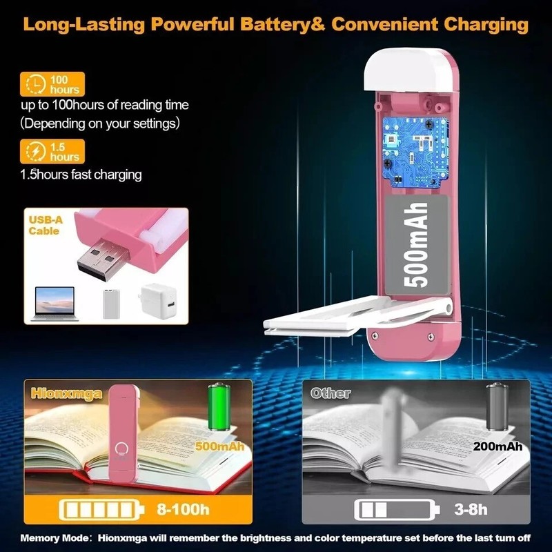- [USB Rechargeable &Long Lasting]:The built-in USB charging port design makes charging very convenient,simply plug it into a power bank,laptop,phone adapter,car charger,etc. This reading lights for books in bed has a 500mAh battery,providing 8-100 hours of reading time (depending on your settings).
