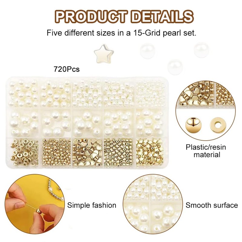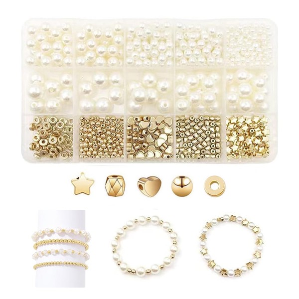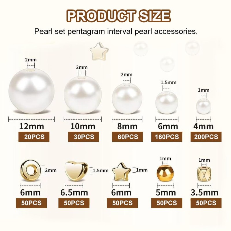 - WHITE PEARLS & GOLD BEADS Inside there are about 470 white beads and 250 gold beads. There are 5 different sizes of beads, namely 12 mm, 10 mm, 8 mm, 6 mm and 4 mm; and 5 types of gold beads, namely round flat spacer beads, round spacer beads, heart-shaped spacer beads, round barrel-shaped spacer beads and star-shaped spacer beads. (Please refer to the pictures for detailed quantity and size)