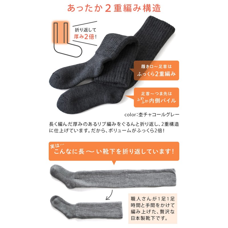 - Warm double knitting: The long knitted thick ribbed knit is folded back to create a double layered construction. That's why the volume is twice full! A layer of air inside and outside keeps the heat inside of the sock from escaping and provides excellent insulation and heat retention. The back of the foot is plump and dense too. Keeps your feet warm and warm all the way up to your feet tend to get cold