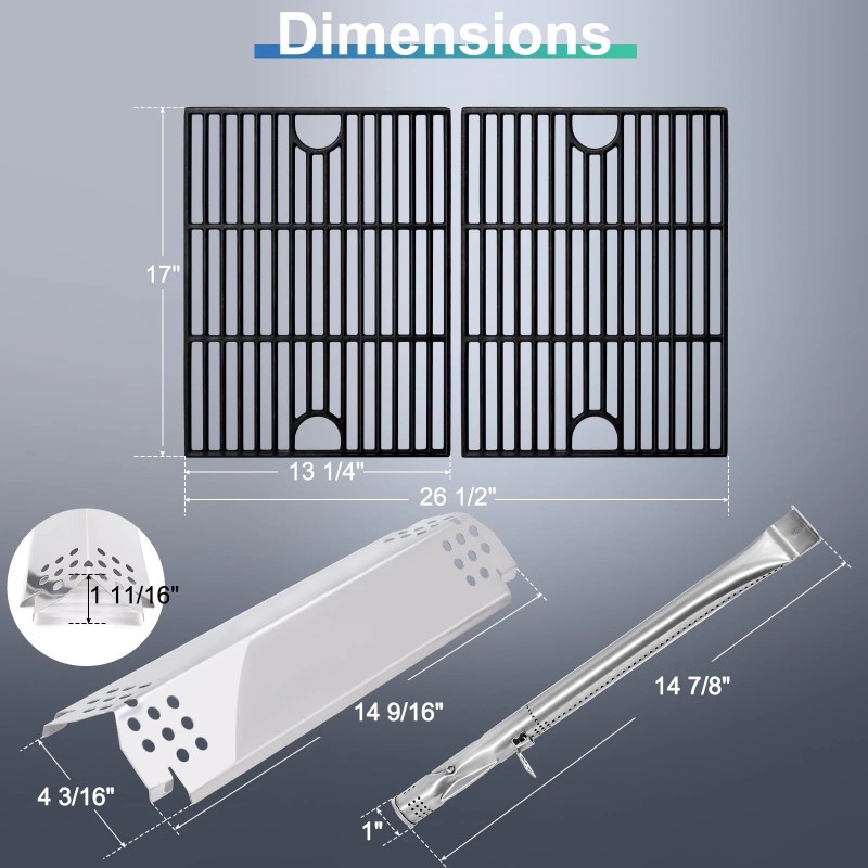 - Cooking Grate: 17" x 13 1/4" each, 17" x 26 1/2" for 2 Pcs