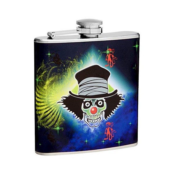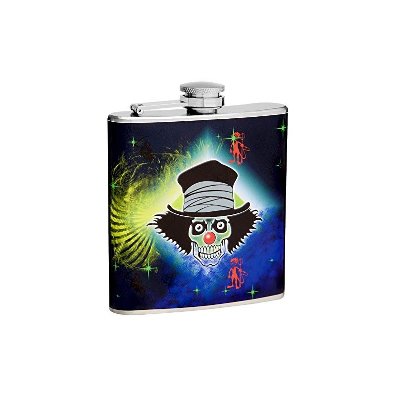 Hip Flask Gift Set with Refill Funnel and 2 Stainless Steel Shot Glasses - Evil Clown Design - Multicolor Wrapped Vinyl Finish - 6 oz Flask - Gift Box Included