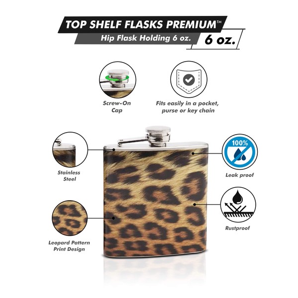6oz Hip Flask - Leopard Pattern Print Design - Pocket Size, Stainless Steel, Leak Proof, Screw-On Cap - Brown and Black Wrapped Vinyl Finish
