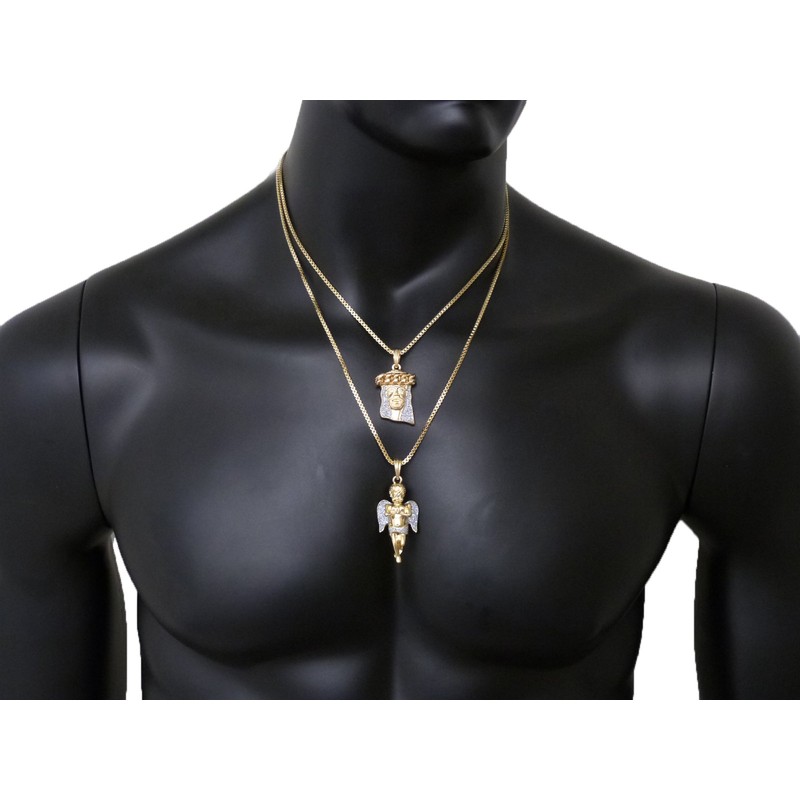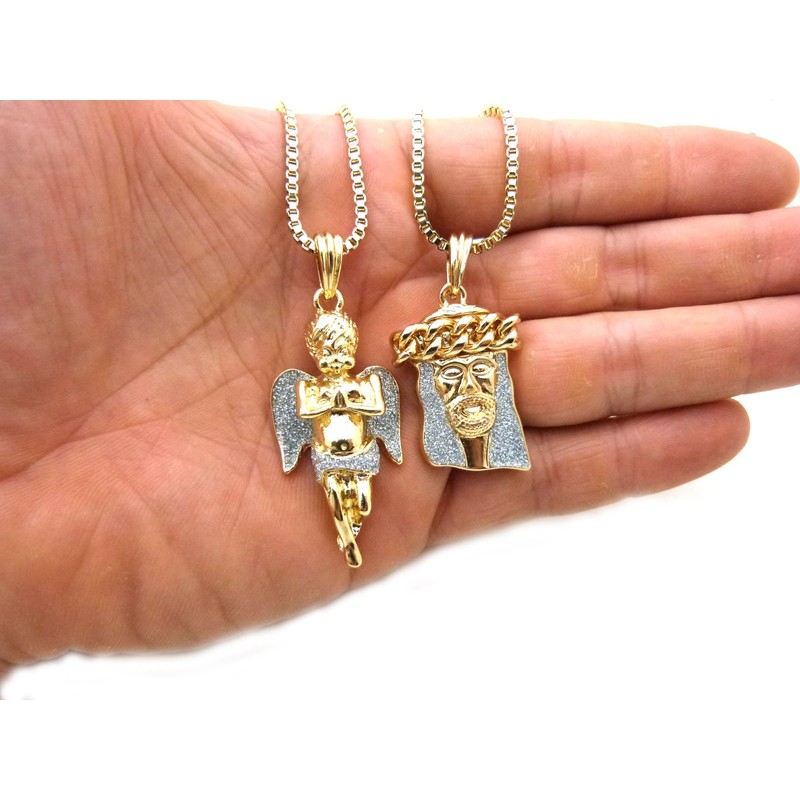 - Hip Hop Sparkled Jesus Face, Praying Angel Pendant 20",24" Box Chain 2 Necklace Set in Gold Silver Color