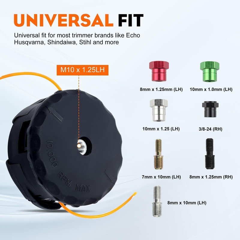 - [UNIVERSAL FIT]: The kit includes various attachments, allowing the trimmer head to achieve universal compatibility, making it suitable for most trimmers, increasing convenience and cost-effectiveness.