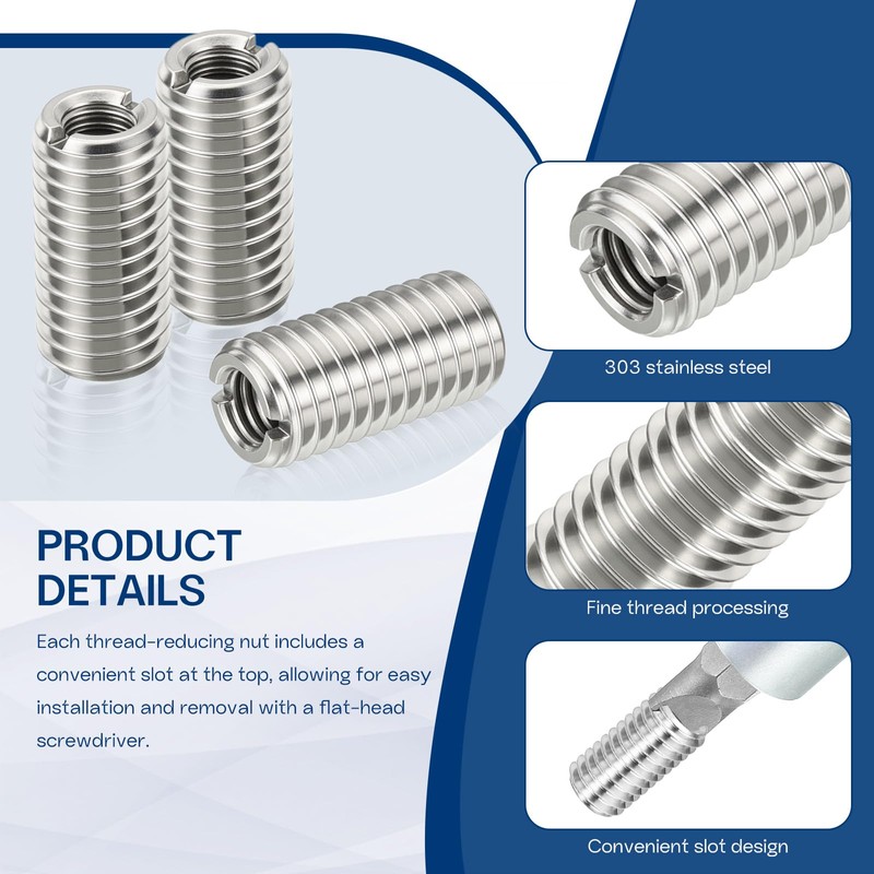 • Feature: Each thread-reducing nut includes a convenient slot at the top, allowing for easy installation and removal with a flat-head screwdriver. Designed for simplicity and efficiency in handling. Features a smooth surface with deep, clear threads for even force distribution.