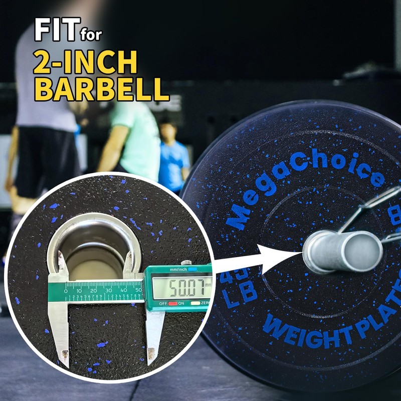 - ✔ 2 INCH WEIGHT PLATES:These rubber plates weights are du-rable , equipped with a reinforced steel ring 50mm hole these plates fit all standard 2" barbell sleeves. and the metal collar isn’t coming off. Each bumper plate has the same diameter only alter in thickness, allow for proper barbell balance and a more efficient lifting experience.