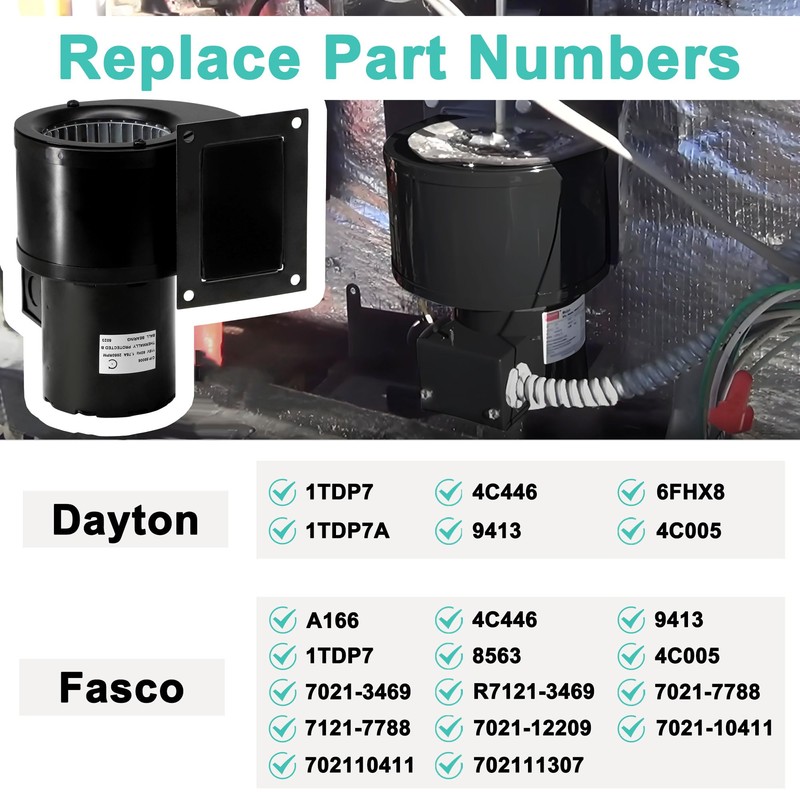 - Replace Part Numbers - Wood Furnace blower motor replaces: Dayton 1TDP7, 4C446, 6FHX8, 4C005, 1TDP7A, 9413; Fasco A166, 7021-3469, R7121-3469, 7021-7788, 7121-7788, 4C446, 9413, 4C005, 1TDP7, 7021-12209, 7021-10411, 702110411, 8563, 702111307