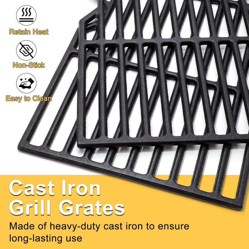 - 【Work Like a Charm】- The cast iron grill grates replacement retain heat well, creating professional sear marks that enhance the flavour of food. The heat plates keep food residue away from the burner and prevent deflagration to protect the burner. The burners with small holes maintain a steady airflow that quickly heats up the grill and evenly heats the food