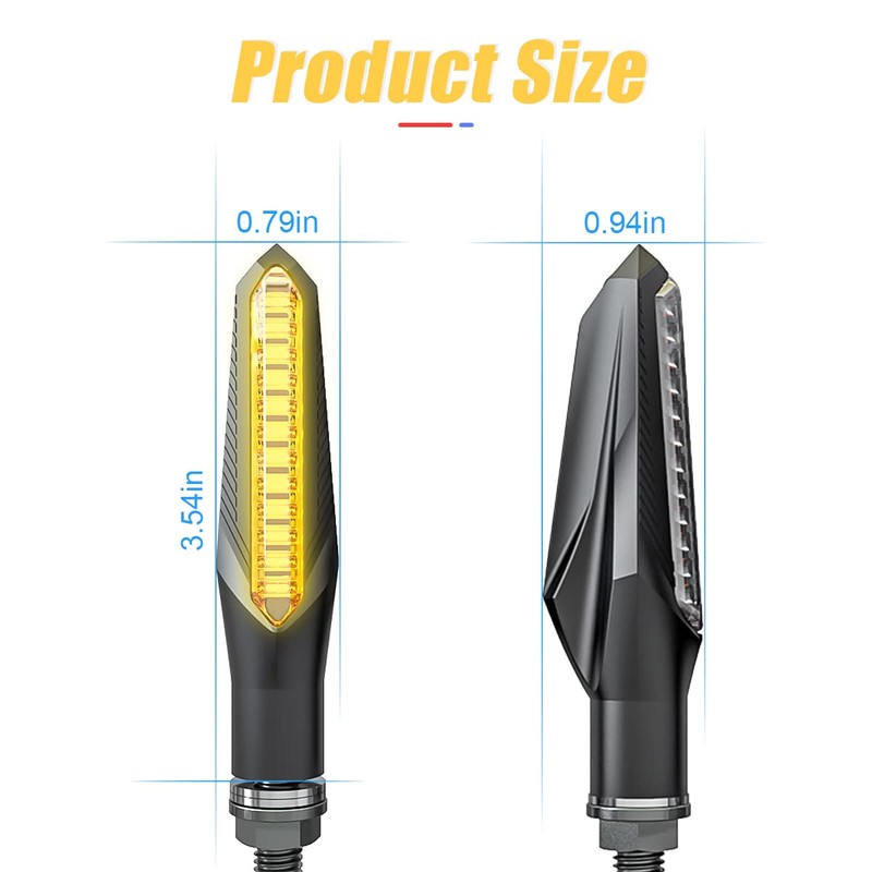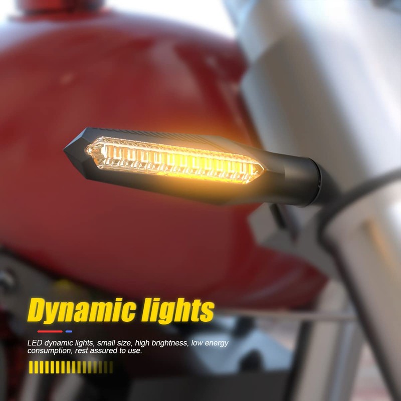 - 【12 LEDs Super Bright】: This motorcycle indicator is equipped with 12 LED bulbs with the latest upgraded 2835 SMD light-emitting beads for clearer and brighter light. The lens optical design makes the flowing effect of IC controller more smooth. They can be used as turn signals, DRL lights and brake lights, giving you more options for road warning lights.