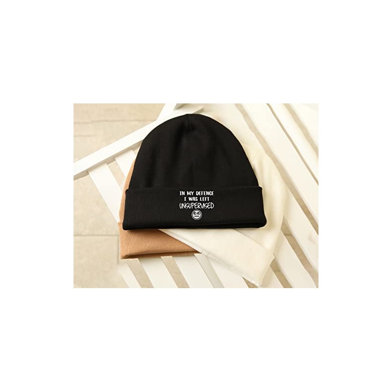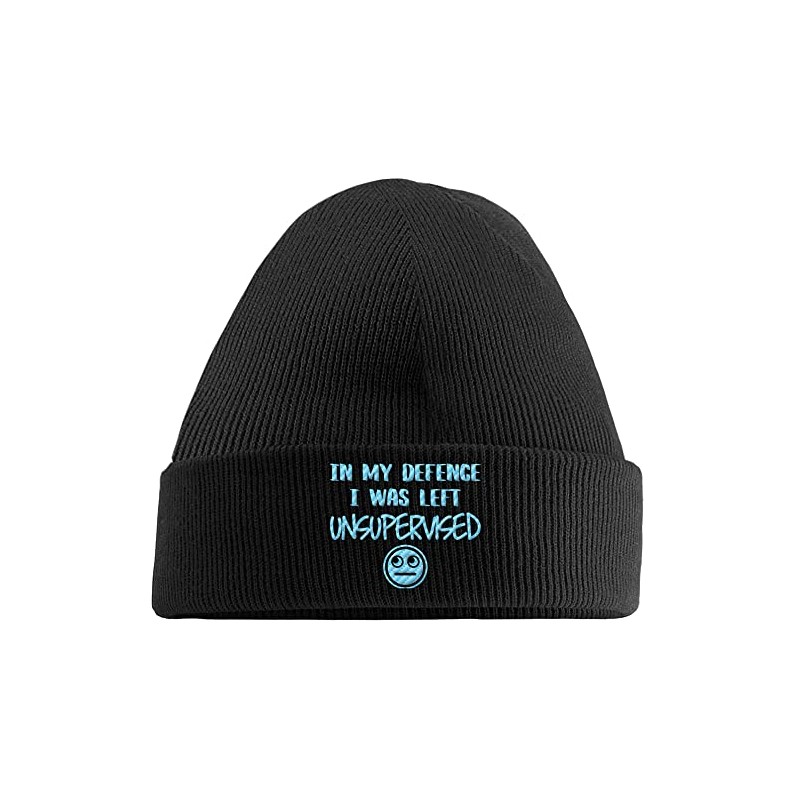 Hippowarehouse in My Defence I was Left Unsupervised Embroidered Beanie Hat Black with Baby Blue Stitch
