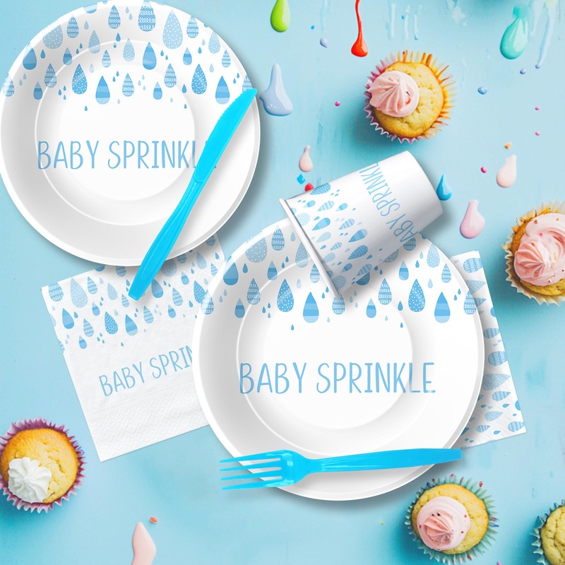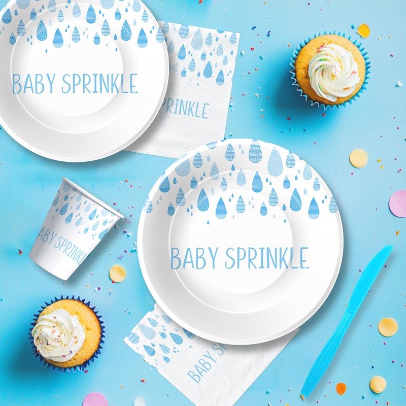 - 【Baby Sprinkle Party Supplies】Featuring a charming blue and white color scheme with raindrop patterns, perfect for baby showers, gender reveals, and sprinkle-themed celebrations.