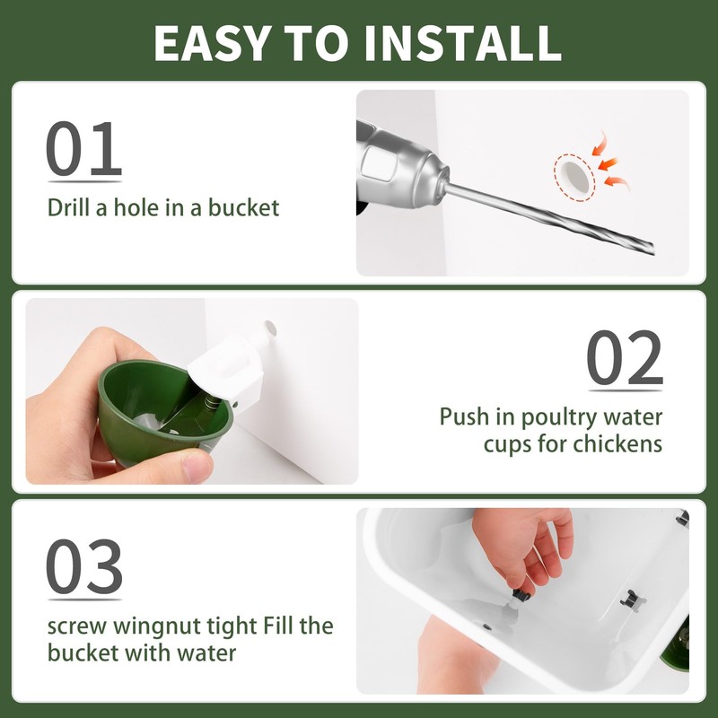 - 🐣Long-Lasting and Durable: Our chicken water cups kit includes 12* cups, 1* drill bit, and full accessories. Made of safe PP material that is BPA-free, our chicken waterer kit is sturdy, durable, and suitable for any weather. It's easy to disassemble and install. If you have any questions about our chicken feeder waterer kit, please don't hesitate to contact us for assistance.