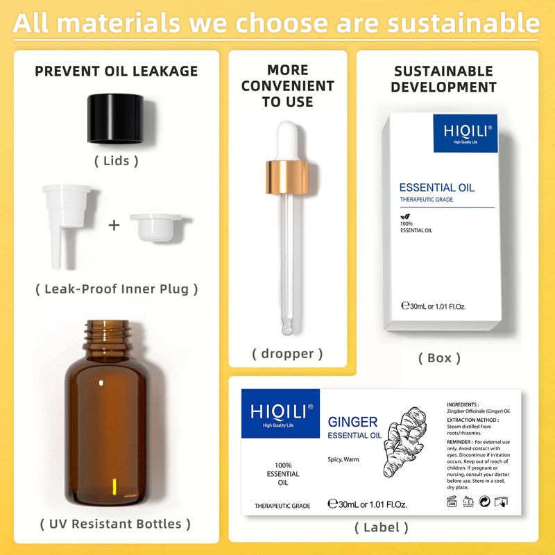 HIQILI Pure Ginger Essential Oil for Lymphatic Drainage Massage, Swelling Pain, Skin, Hair, Diffuser - 30ml 1 Fl Oz