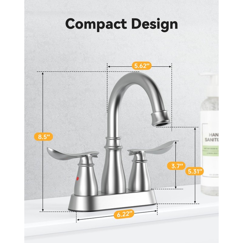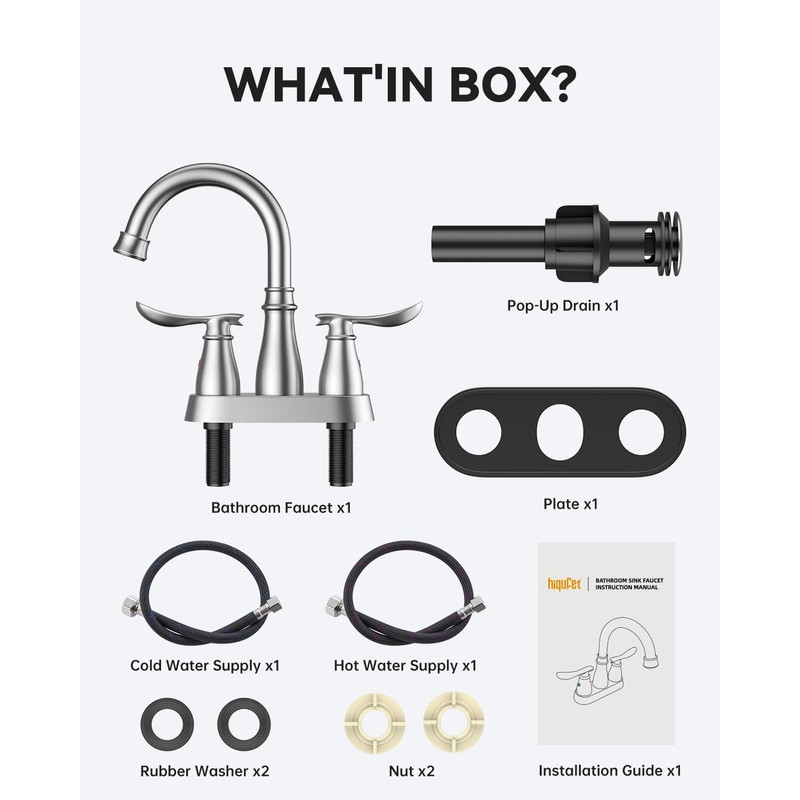 - EASILY TO INSTALL: Hiqufet bath faucet comes with all necessary fittings, 4 inch centerset bathroom faucet, rubber washer, screw nut, water supply hose, installation guide, because you can also finish the installation of our pre-installed bathroom faucet within 10-15 mins