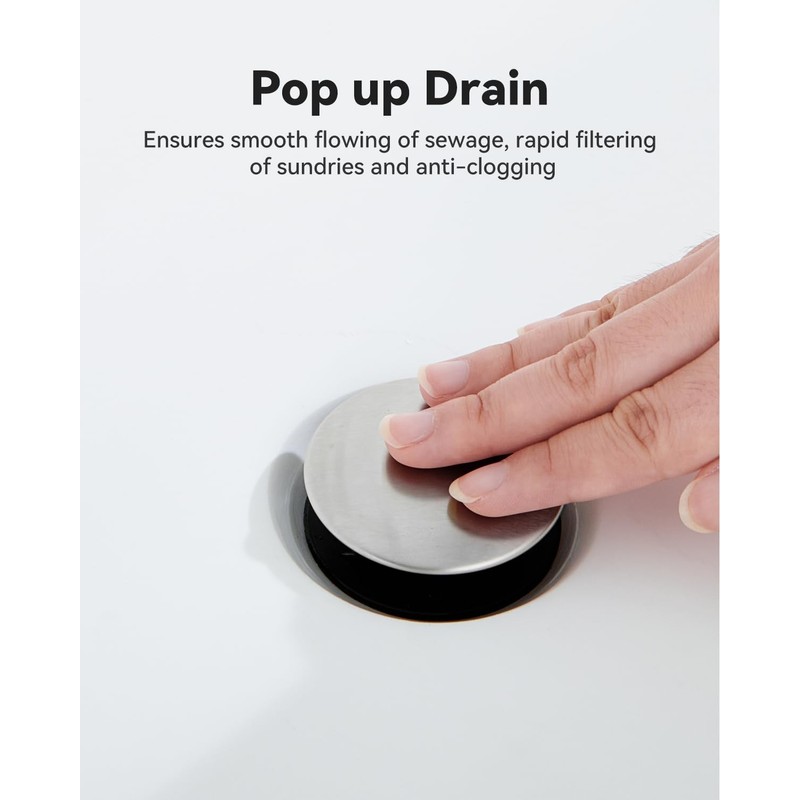 - FAST FLOW, NO CLOGS POP-UP DRAIN: Easy-to-use pop-up drain ensures quick water release and resists clogging, keeping your sink clean and flowing smoothly