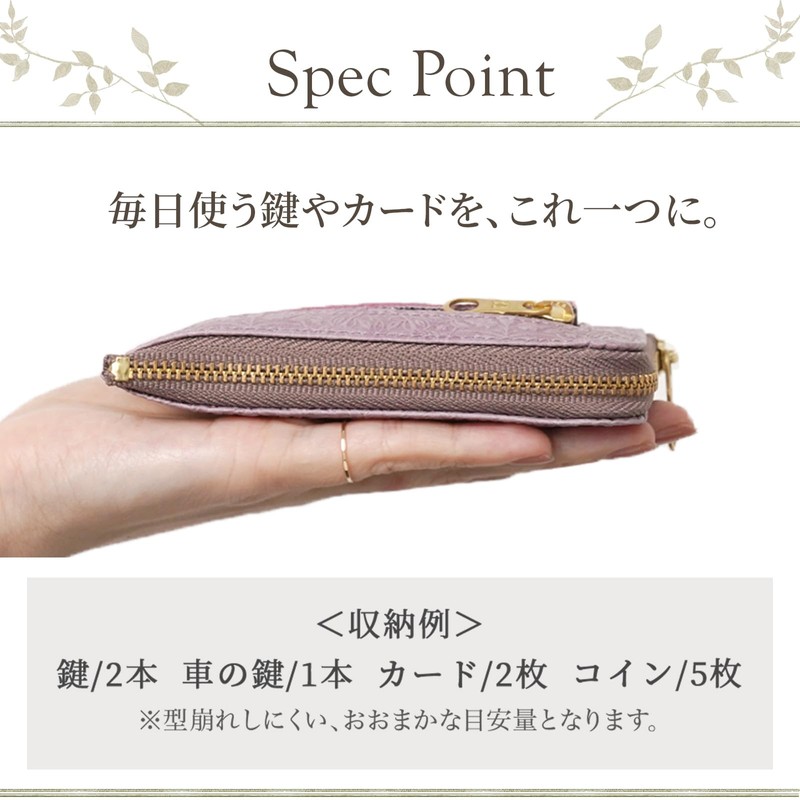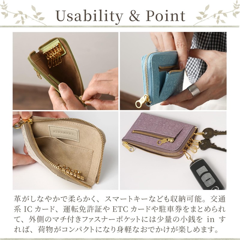 - (Reliable Storage Capacity in Slim Form) A L-shaped zipper type key case that can also store smart keys. The mouth opens wide, making it easy to see and remove the contents inside. You can bring out not only keys, but also cards and coins, so you can use this one for a quick outing