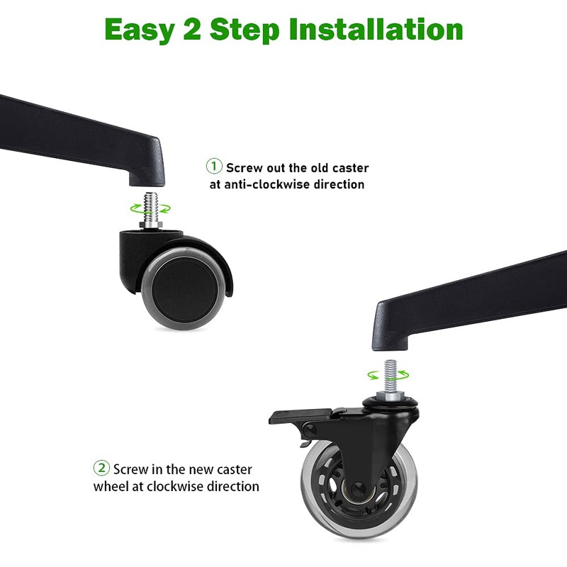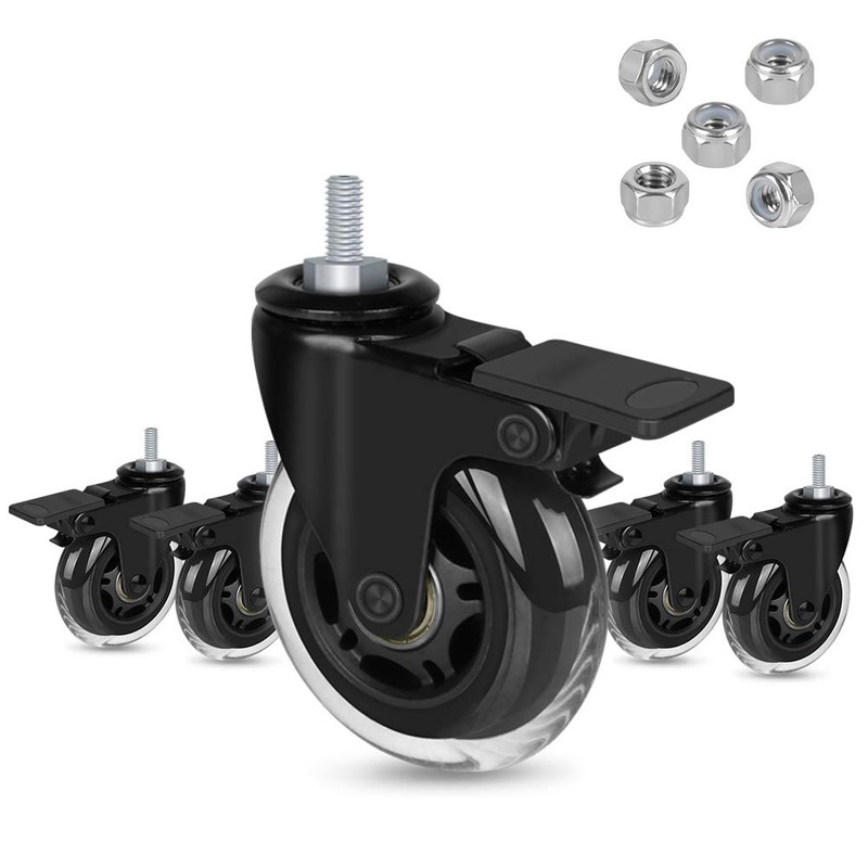 With metal double brake casters, environmentally friendly materials. Double ball bearing, black polyurethane(PU) Caster , would not scratch the floor, Silent, no traces, no damage to the ground, easy to install, versatile, safe and labor-saving. These casters are perfect for chairs, furniture ,workbench, cart, trolley, shelf, wooden cabinet, furniture, home appliances, etc.
