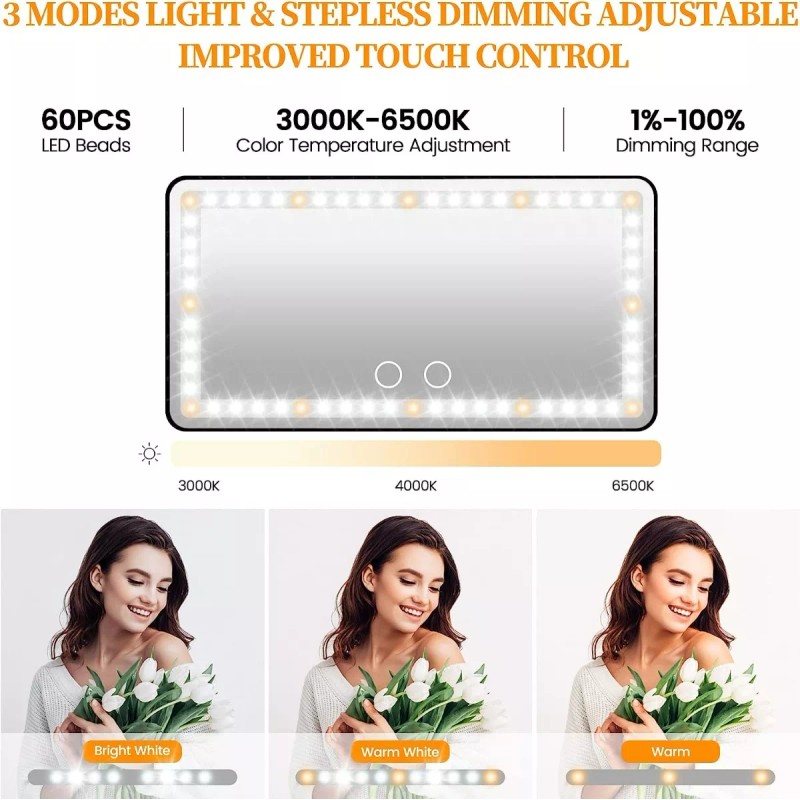 Hay dos sensores táctiles, simplemente toque uno de los interruptores táctiles para encender y apagar. Puede cambiar los dos colores de las luces (blanco frío, amarillo cálido). Mantenga presionado para ajustar el brillo de las luces. La función de memoria hace que este espejo con luces vuelva al mismo brillo y color cuando lo usó por última vez.