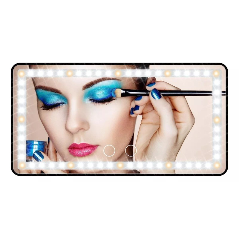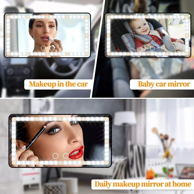 El espejo de maquillaje para automóvil tiene 12 luces amarillas y 48 luces blancas, que es un 40 % más brillante y un 60 % menos de energía que las bombillas normales. Presione brevemente los 2 interruptores de sensor para reemplazar 3 colores de luz: blanco, amarillo, blanco y amarillo. Mantenga presionado para atenuar según lo que necesite. La temperatura de color de 2500-6500K es equivalente a la luz solar al aire libre, el maquillaje naturalmente no es diferente.