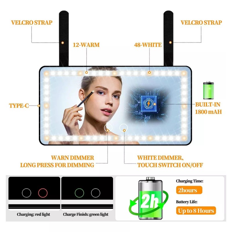 El espejo del automóvil funciona con una batería de litio o un cable USB, que se puede cargar a través del enchufe, la computadora, la energía móvil, y puede usar el espejo de tocador con luces en cualquier lugar y en cualquier momento. Batería recargable de 1800 mAh que usamos Puede usarla durante 8 horas sin cargarla. Calculado usando 30 minutos por día, la batería de litio se puede usar durante al menos 10 días con una carga.